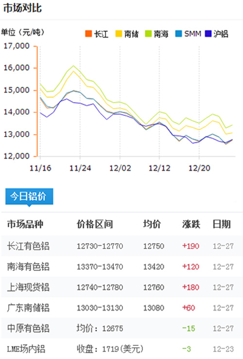 鋁錠價(jià)格今日鋁價(jià)2016-12-27